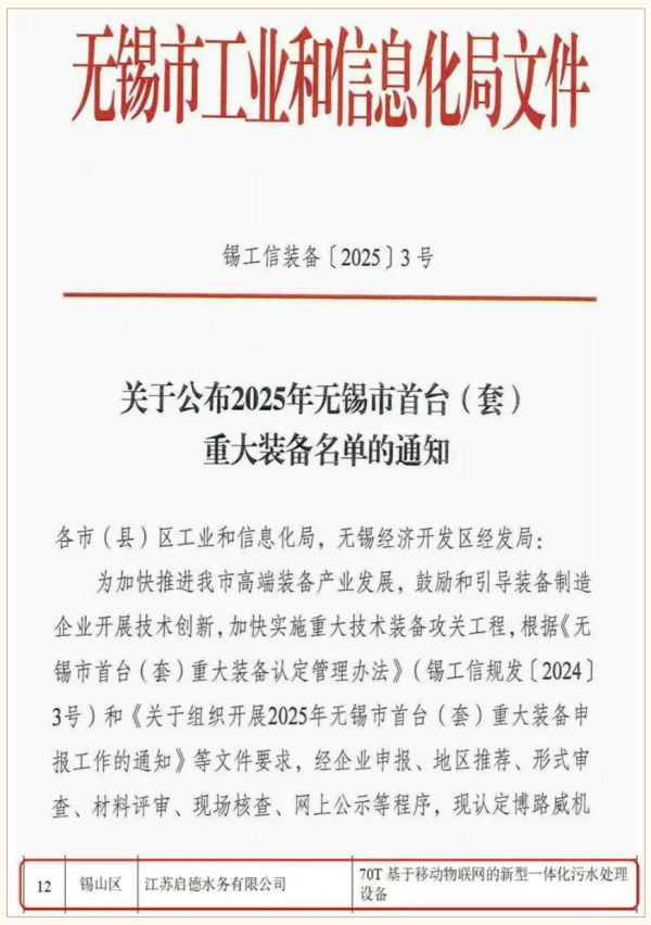 近日,无锡市工业和信息化局公布了2025年度市级首台(套)重大装备名单,省环保集团产业公司所属江苏启德水务有限公司的“70T基于移动物联网的新型一体化污水处理设备”成功入选,这一认定不仅是对该产品技术创新性与市场应用价值的权威认可,更是对公司在环保装备领域自主研发实力的充分肯定。